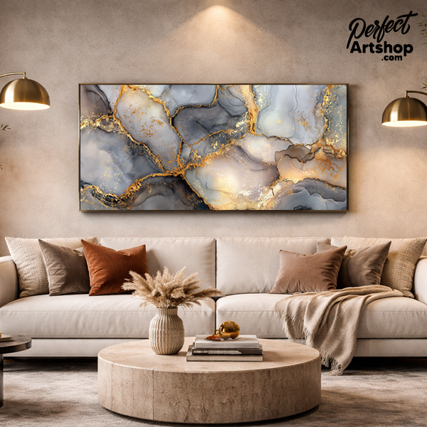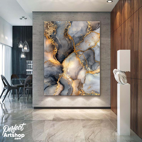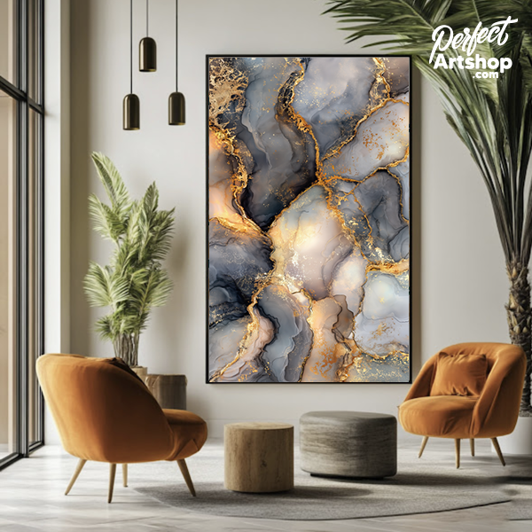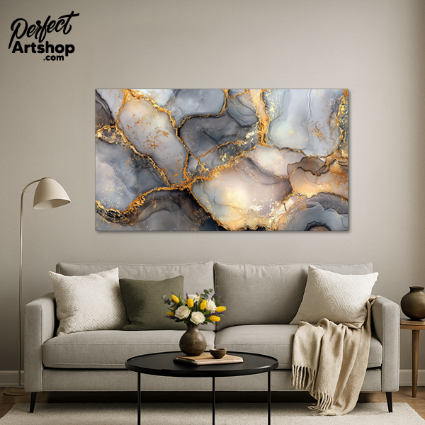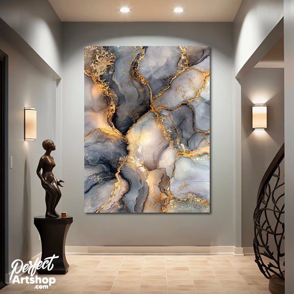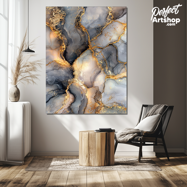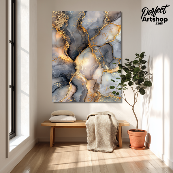 Een tijdloos ontwerp met een mistige basis van grijs en wit, verrijkt met warme gouden accenten. De vloeiende vormen en zachte kleurovergangen creëren een gevoel van ruimte en rust. Een subtiele maar luxe toevoeging aan elk modern huis.