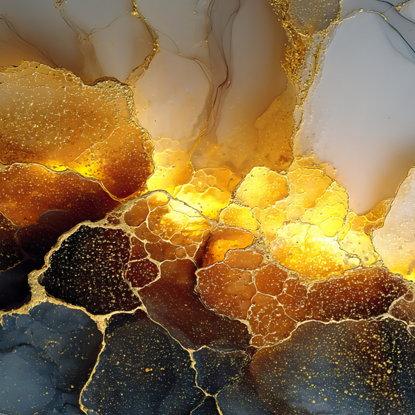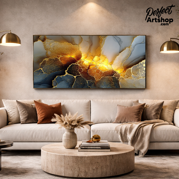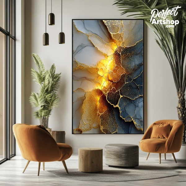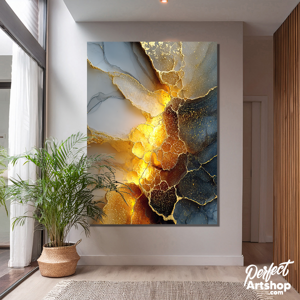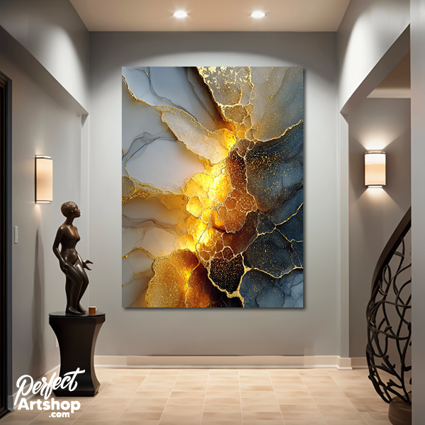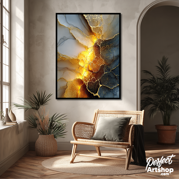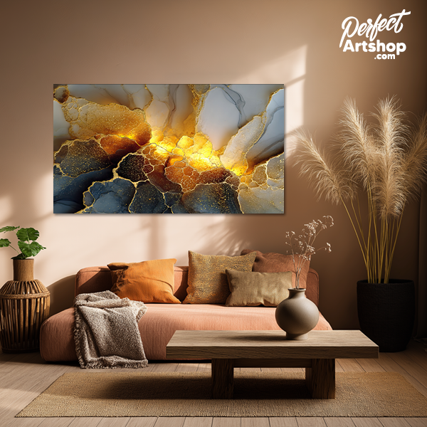 Krachtig en vurig. Dit artwork combineert dramatisch rookgrijs met een explosie van vloeibaar goud. Het licht lijkt vanuit het kunstwerk zelf te komen, waardoor het de absolute eyecatcher van je wand wordt. Prachtig op brushed aluminium voor een modern, industrieel accent.