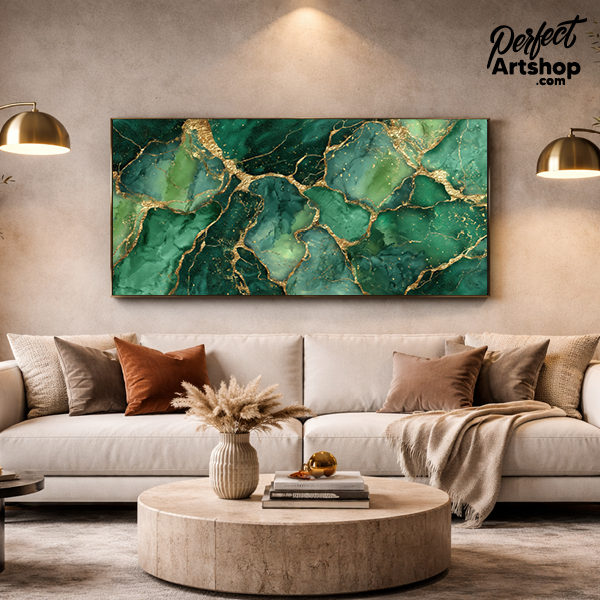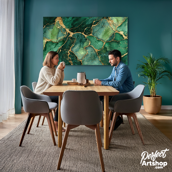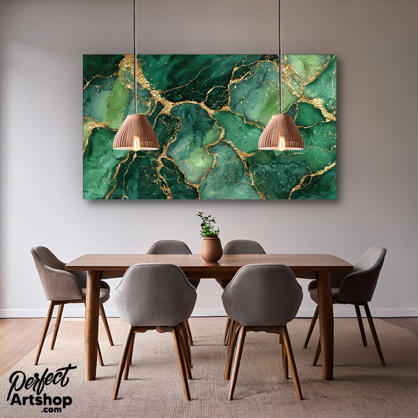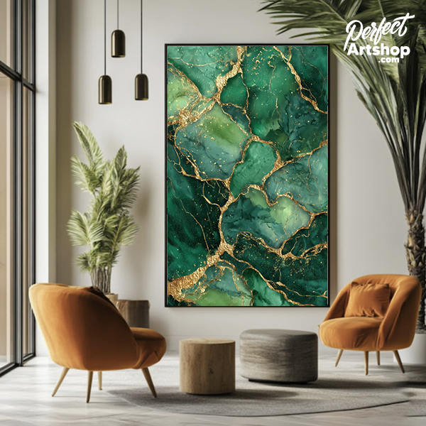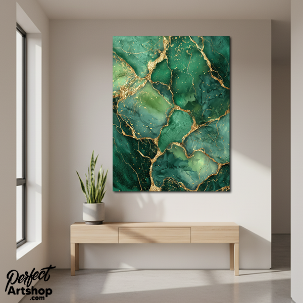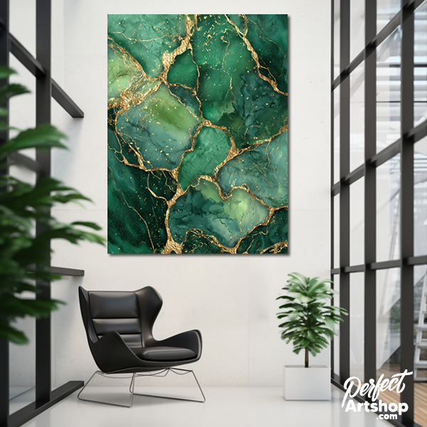 en ode aan de natuur in haar meest luxe vorm. De diepe, gelaagde groentinten doen denken aan kostbare edelstenen. De gouden breuklijnen zorgen voor een schitterend contrast, wat op plexiglas zorgt voor een ongekende diepte en glans.