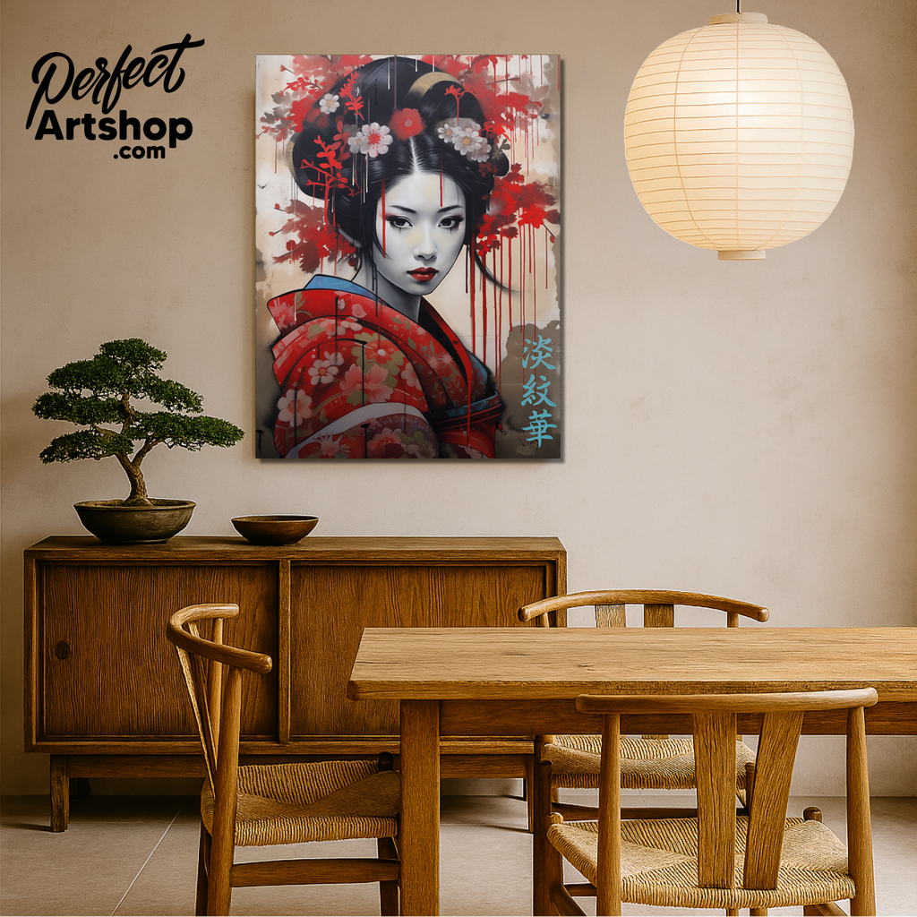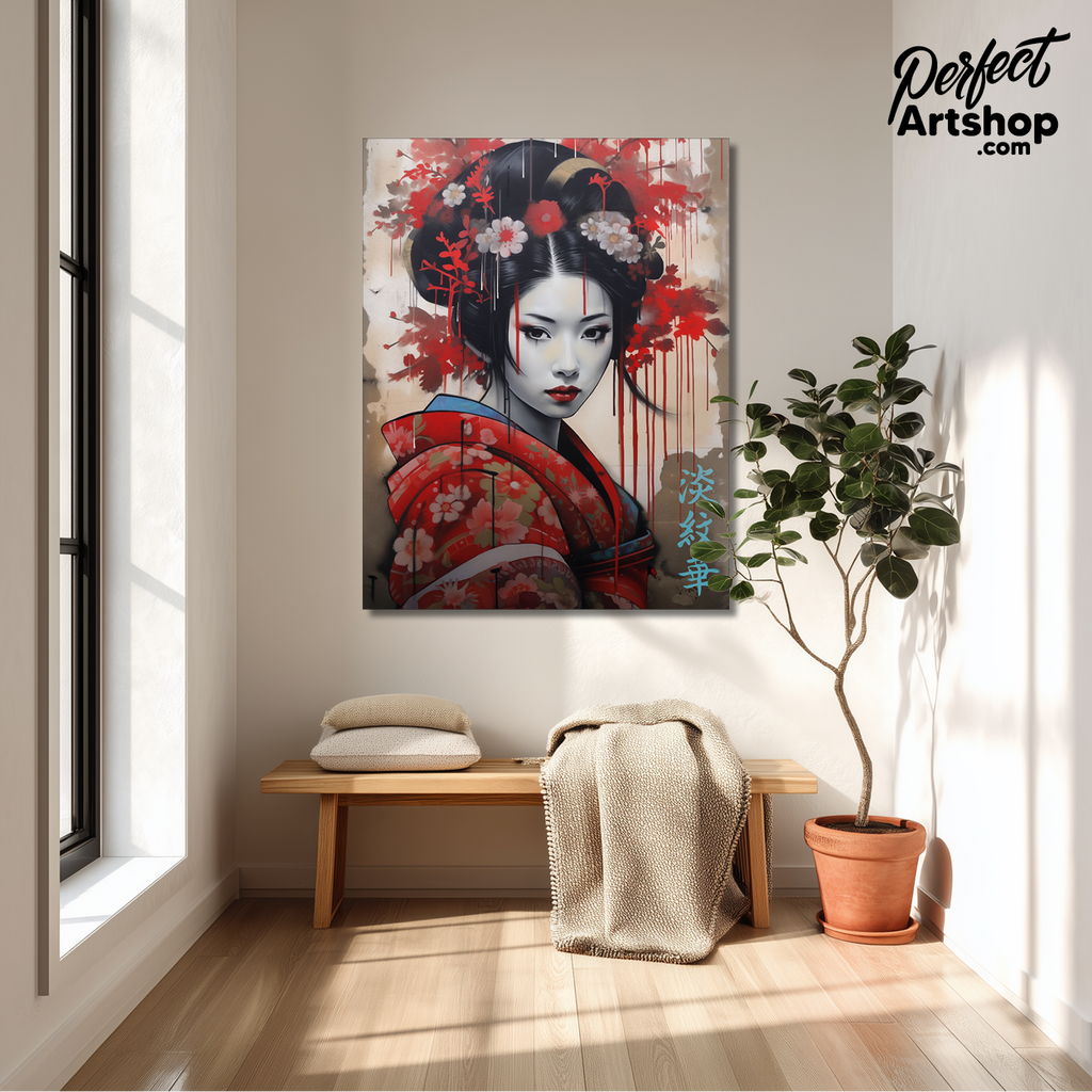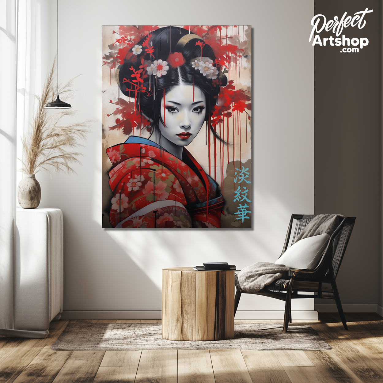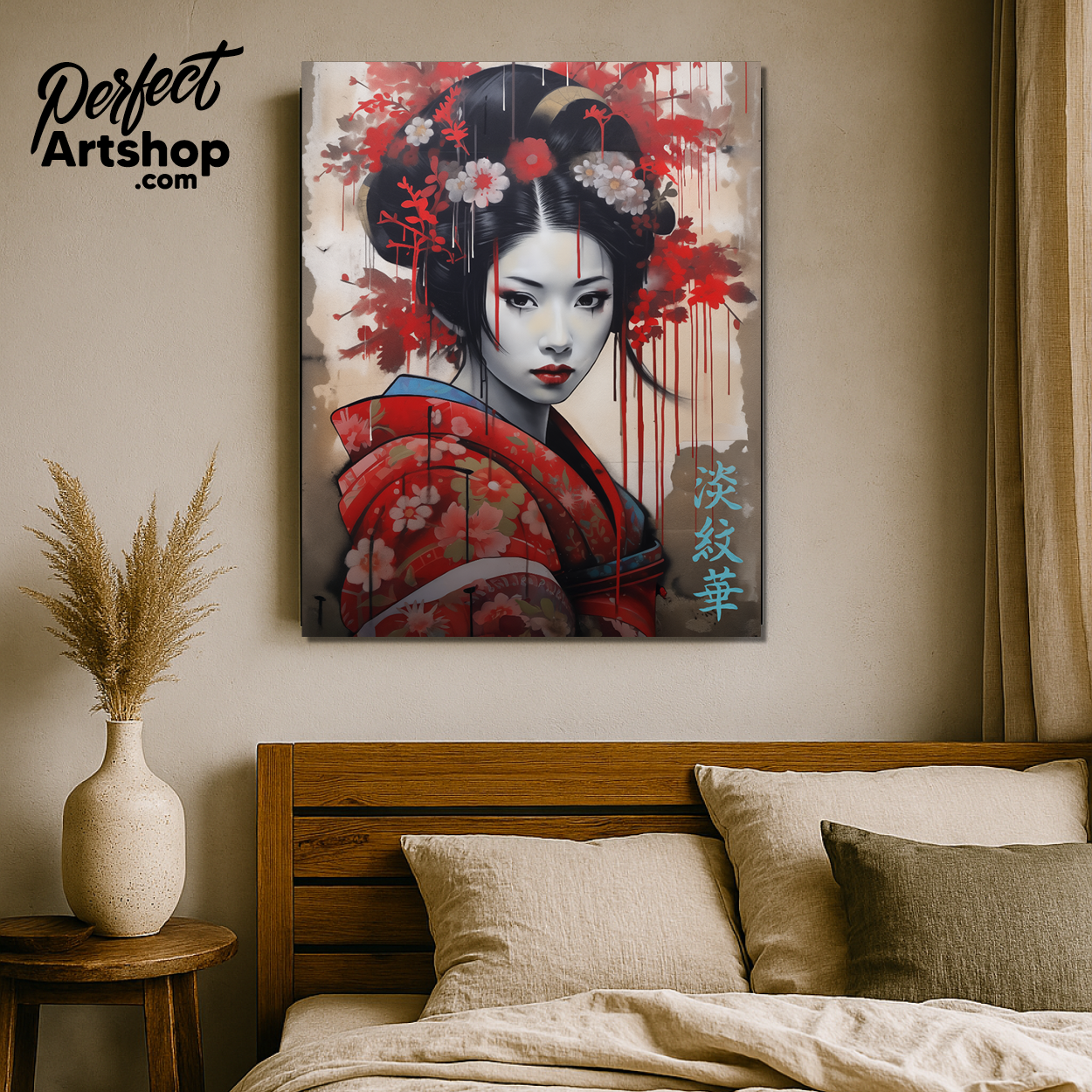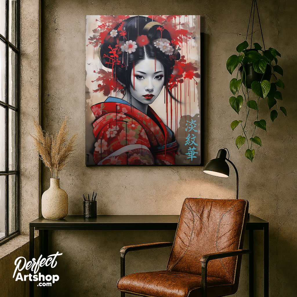 Een ode aan vrouwelijke kracht en verfijning. “Crimson Grace” van Perfect Artshop vangt de essentie van traditie en rebellie in één beeld. Een portret dat traditie en rebellie verenigt, een eerbetoon aan de Japanse esthetiek, met een moderne twist.