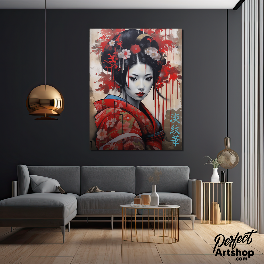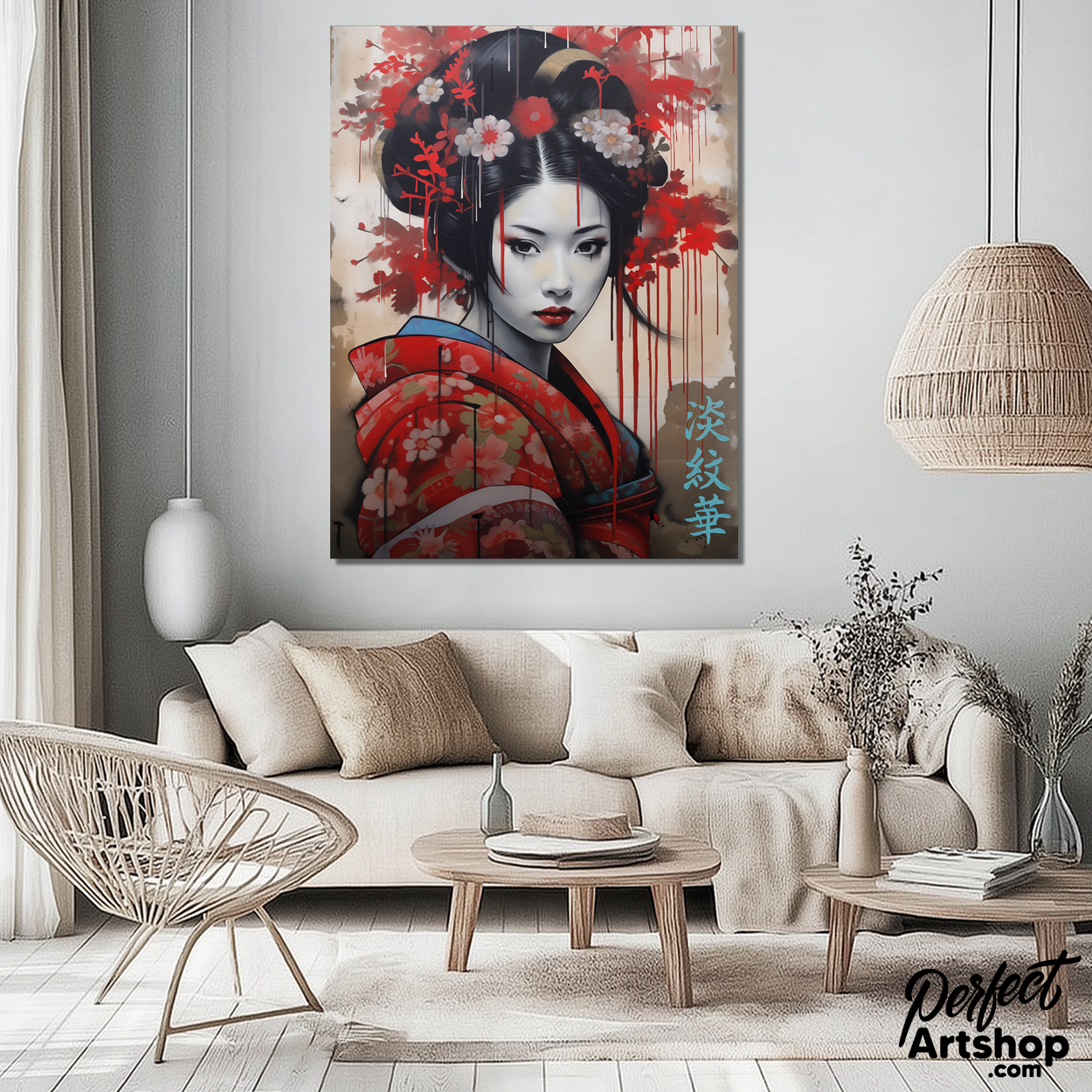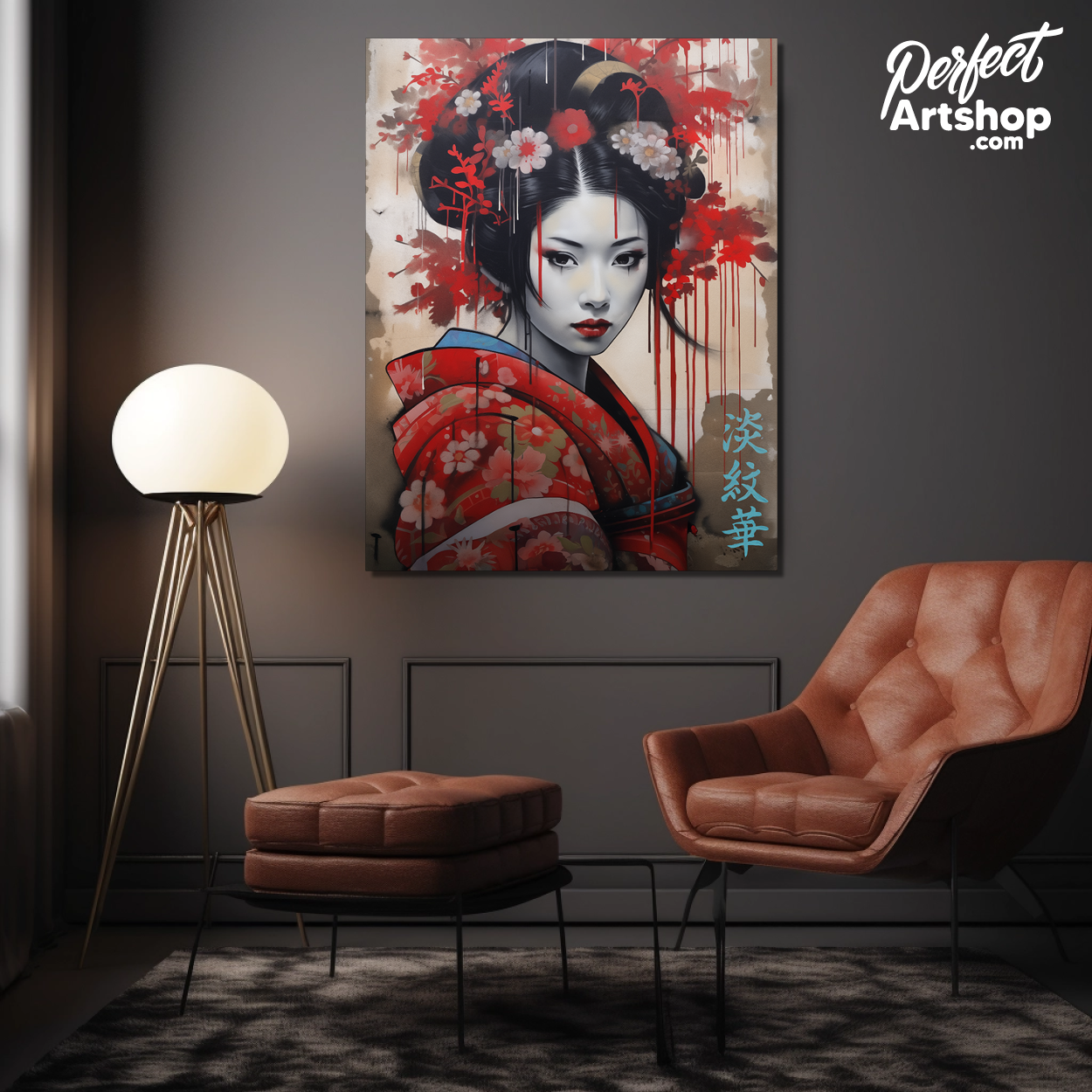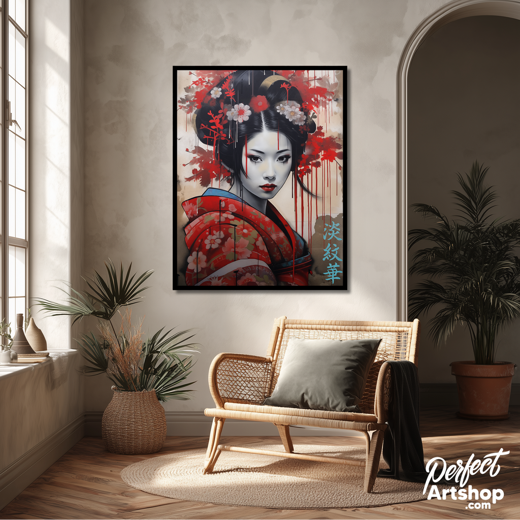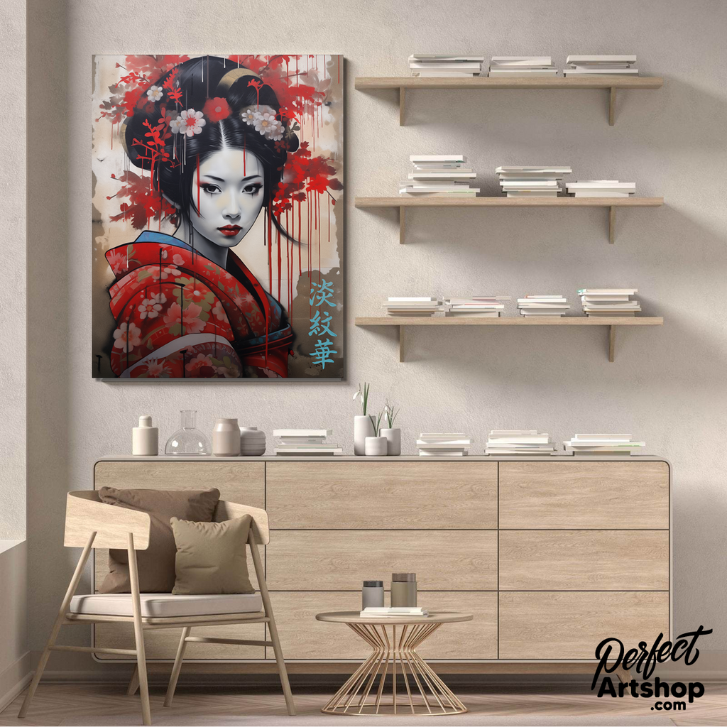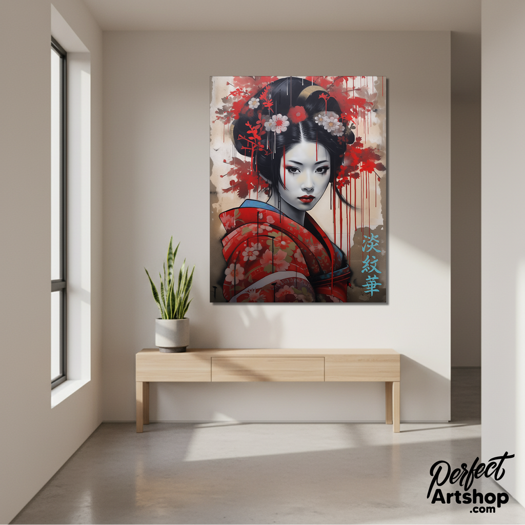 Een ode aan vrouwelijke kracht en verfijning. “Crimson Grace” van Perfect Artshop vangt de essentie van traditie en rebellie in één beeld. Een portret dat traditie en rebellie verenigt, een eerbetoon aan de Japanse esthetiek, met een moderne twist.
