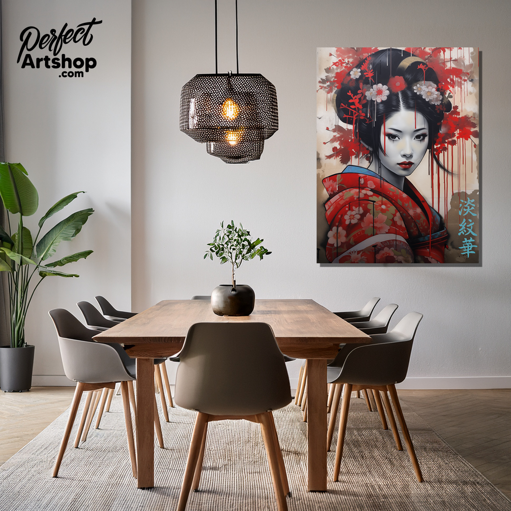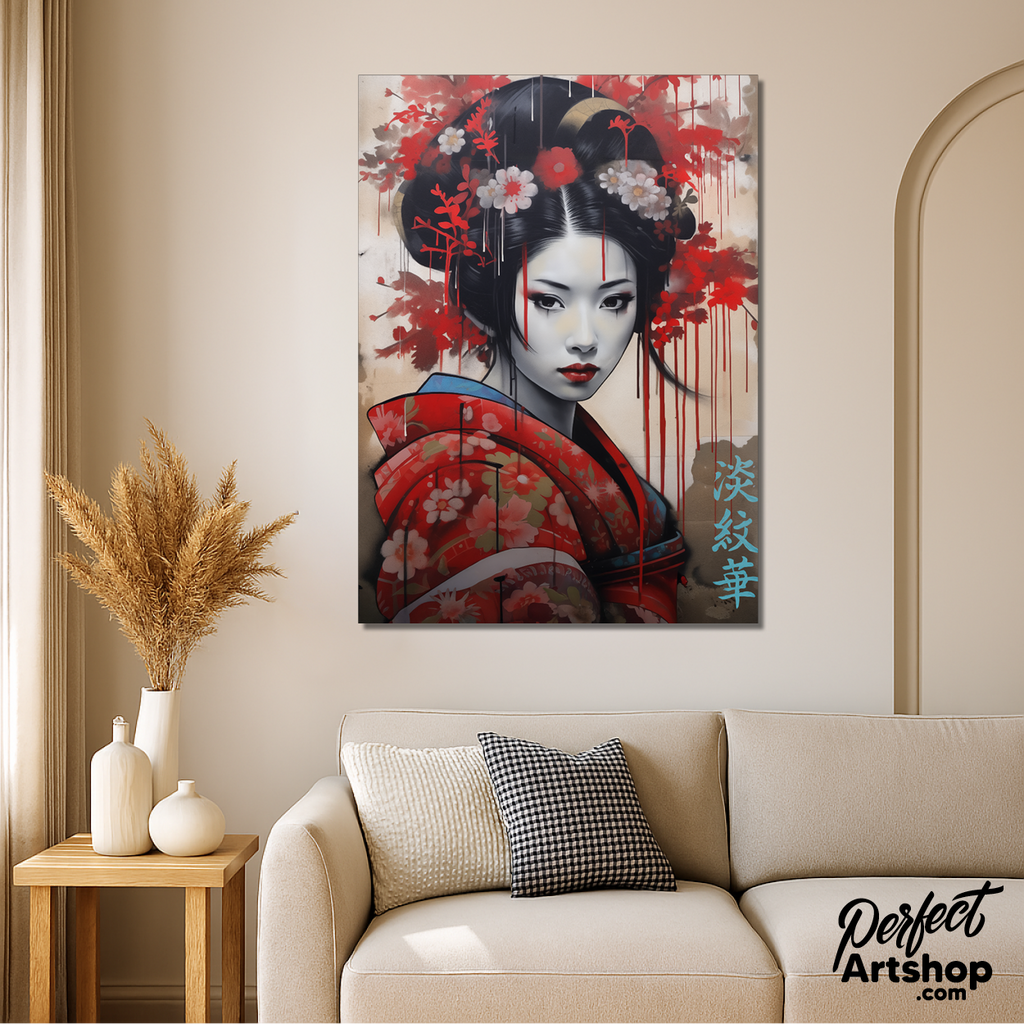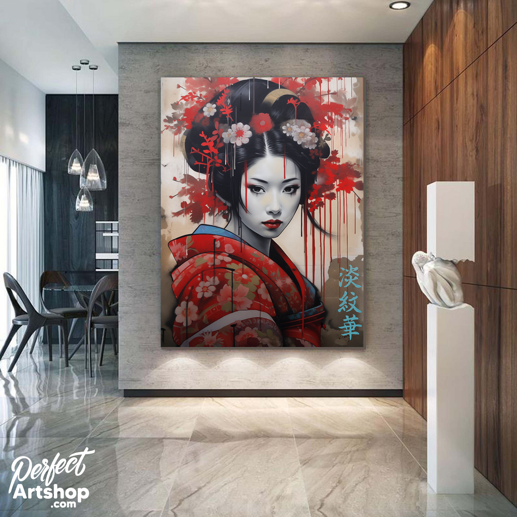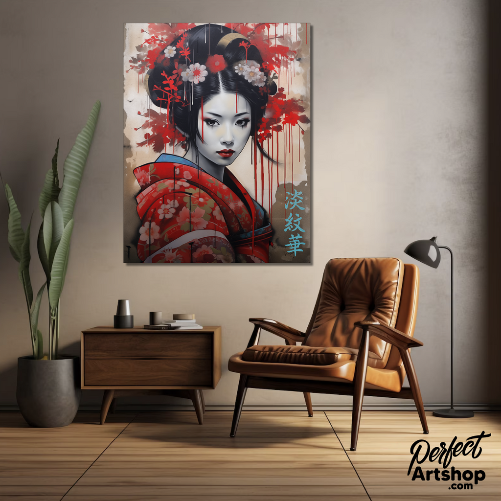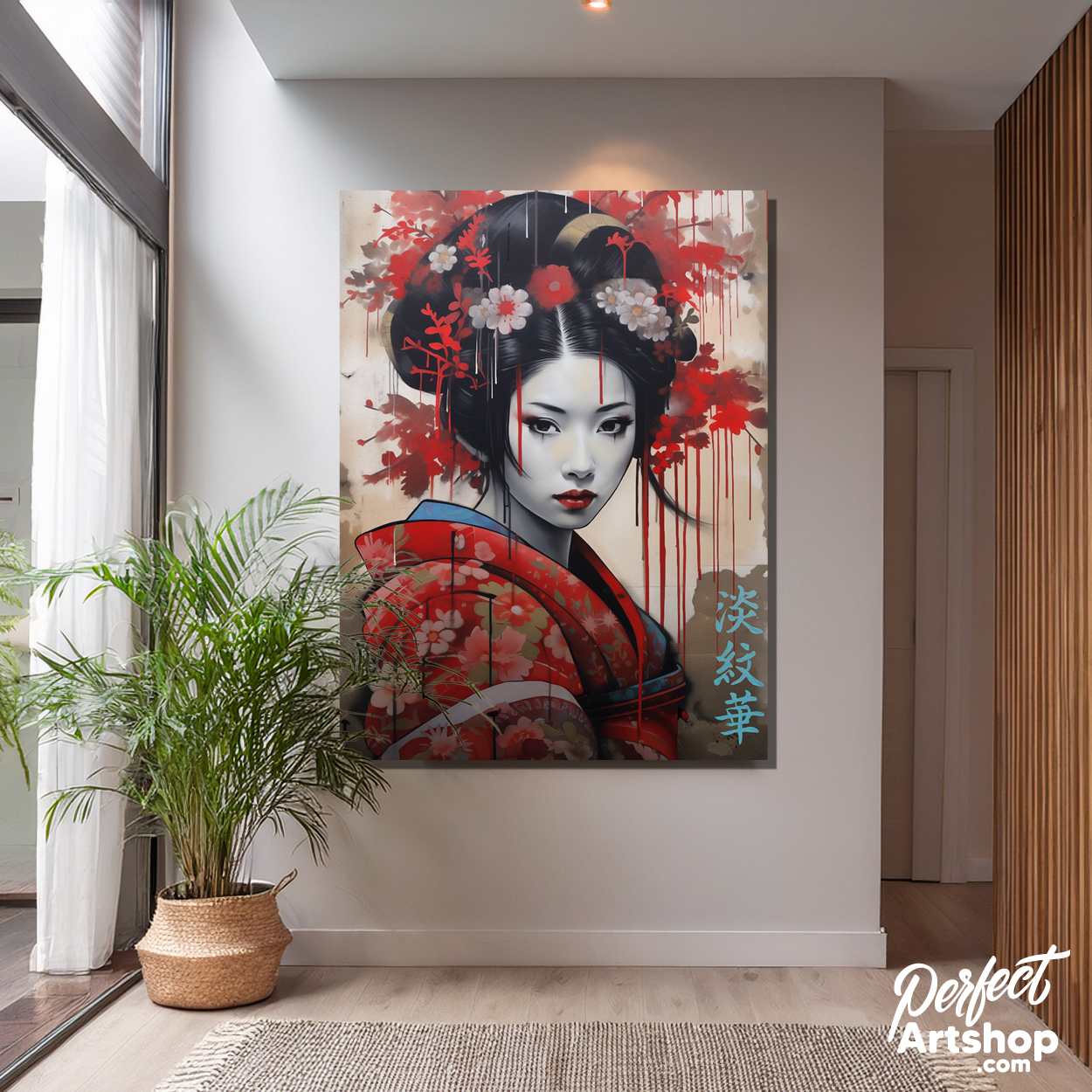 Een ode aan vrouwelijke kracht en verfijning. “Crimson Grace” van Perfect Artshop vangt de essentie van traditie en rebellie in één beeld. Een portret dat traditie en rebellie verenigt, een eerbetoon aan de Japanse esthetiek, met een moderne twist.