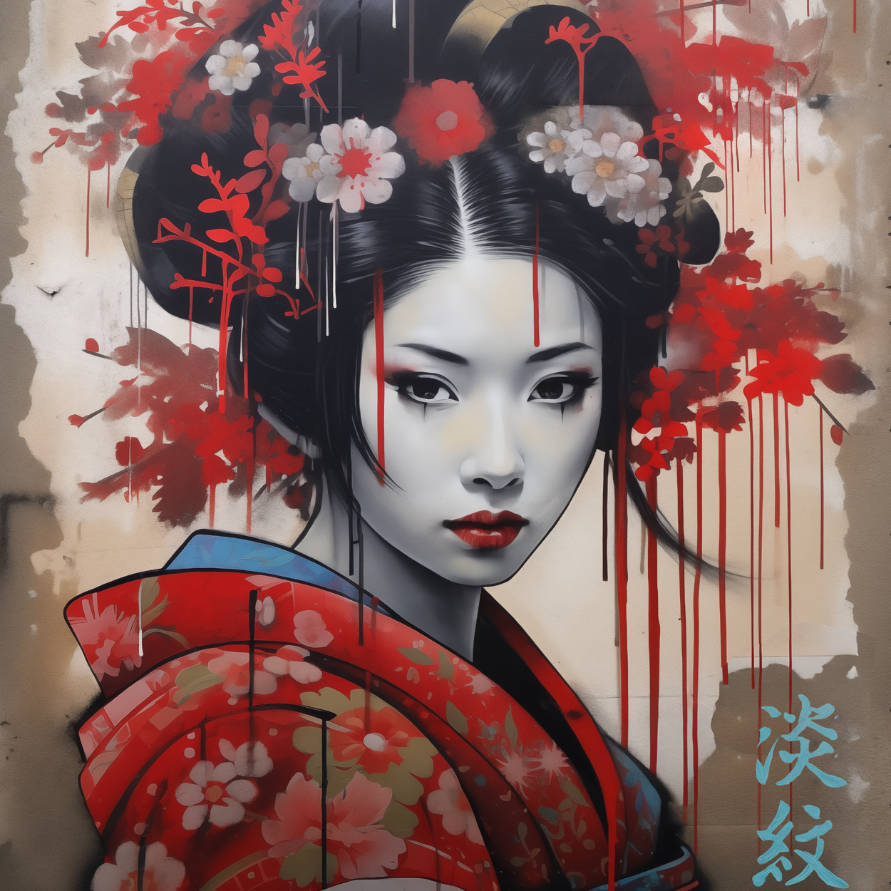 Dit werk combineert klassieke Japanse esthetiek met moderne street-art flair — een krachtige mix van cultuur, schoonheid en identiteit. Elk detail, van haar blik tot de bloesems in haar haar, vertelt een verhaal van elegantie en innerlijke vuur.