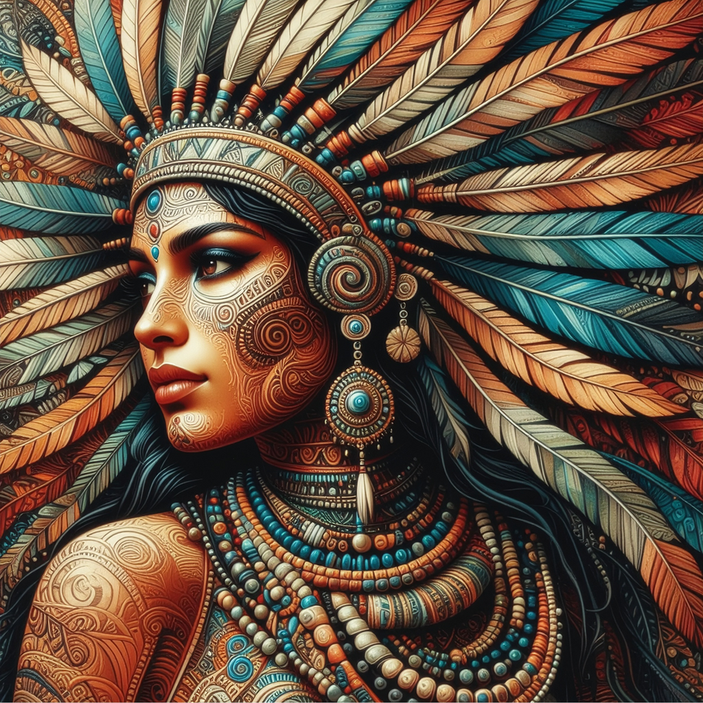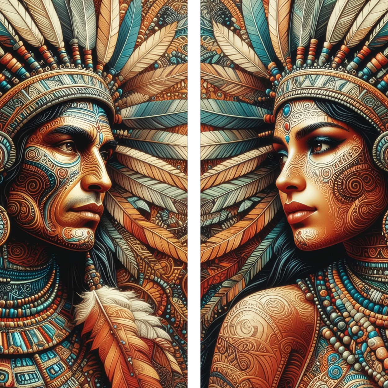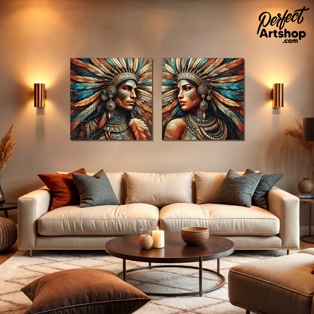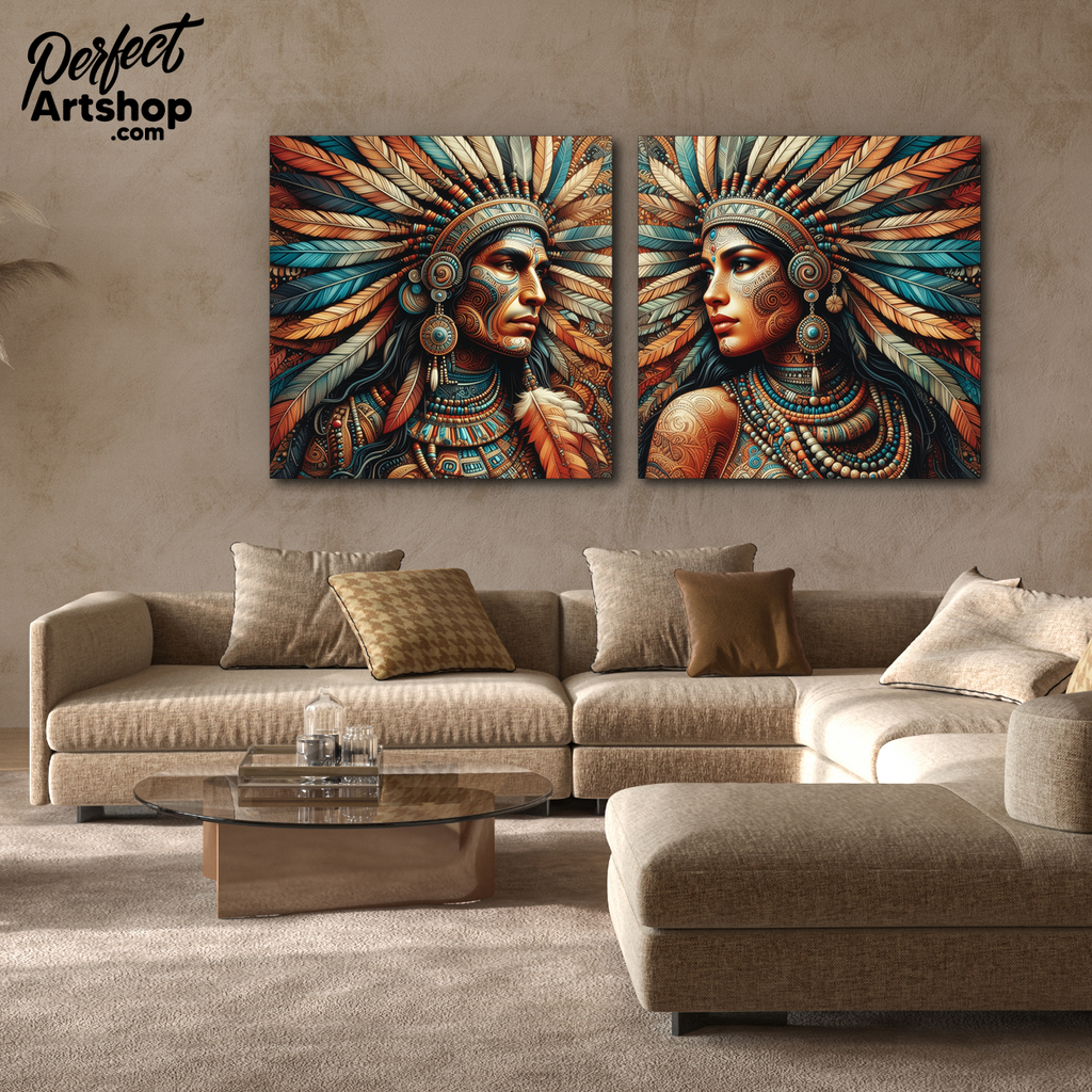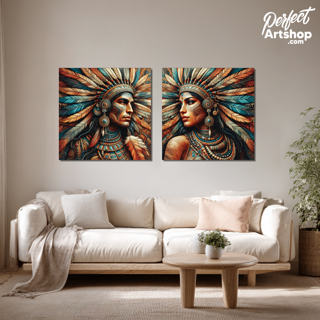 Digitaal kunstwerk van een tweeluik van een mannelijke en vrouwelijke Indiaan, native American. U koopt dus twee platen van een bepaald formaat die u mooi naast elkaar kunt hangen.