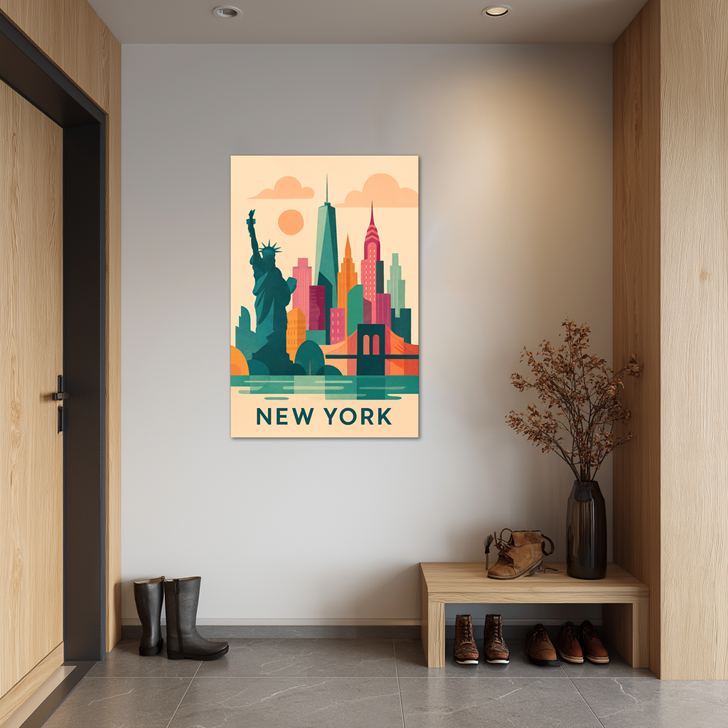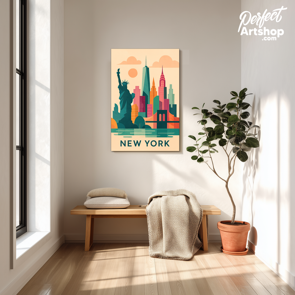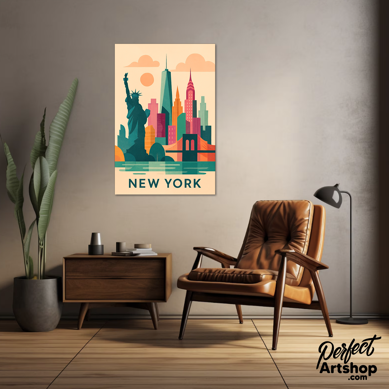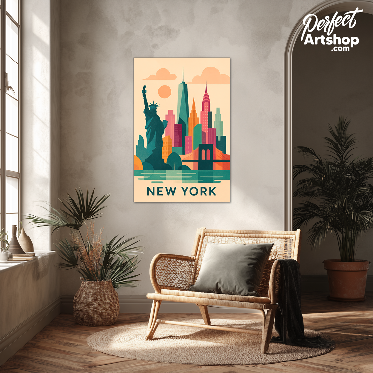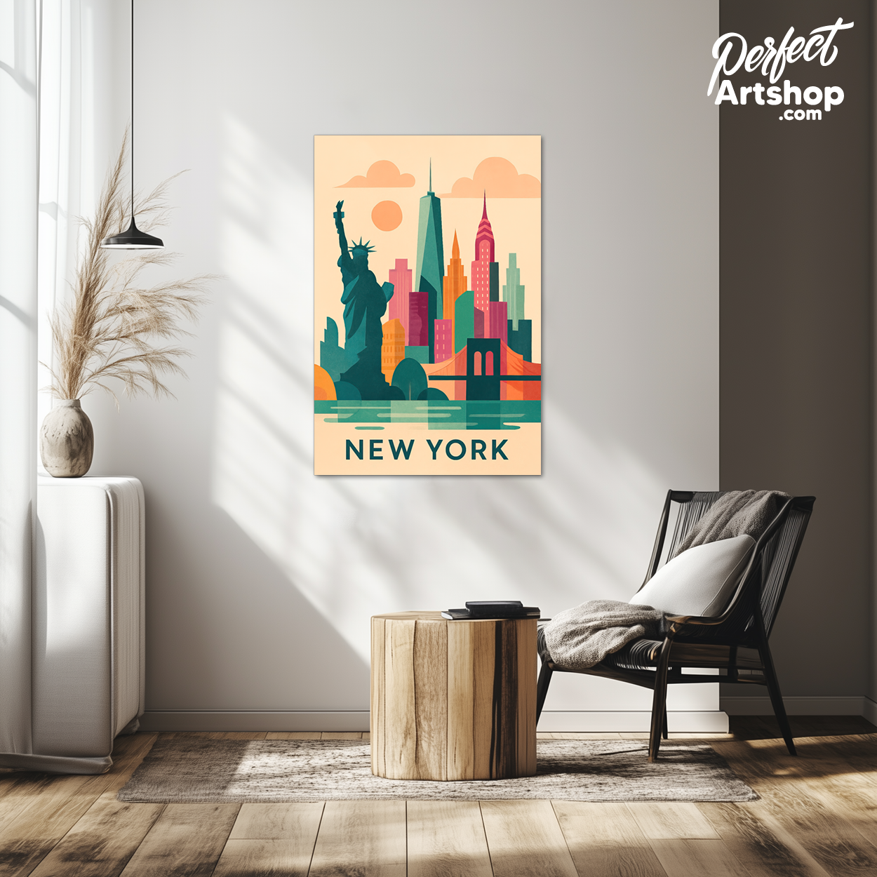 Pop art abstracte illustratie van NEW YORK in roze-, paars- en groen tinten.