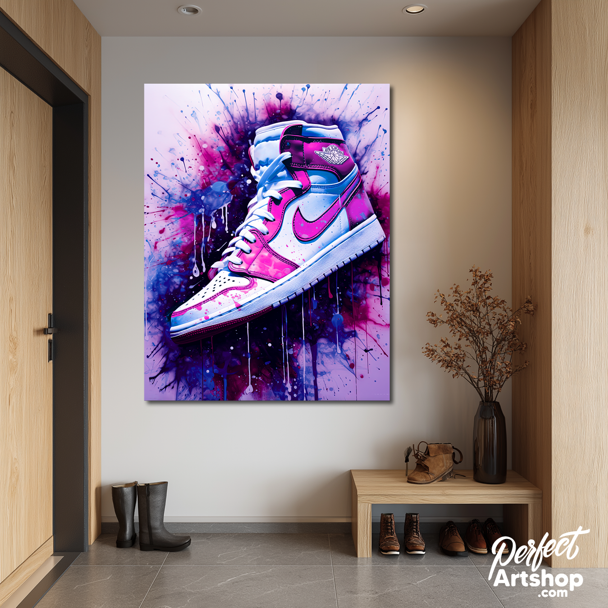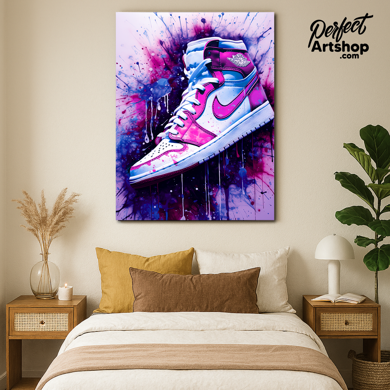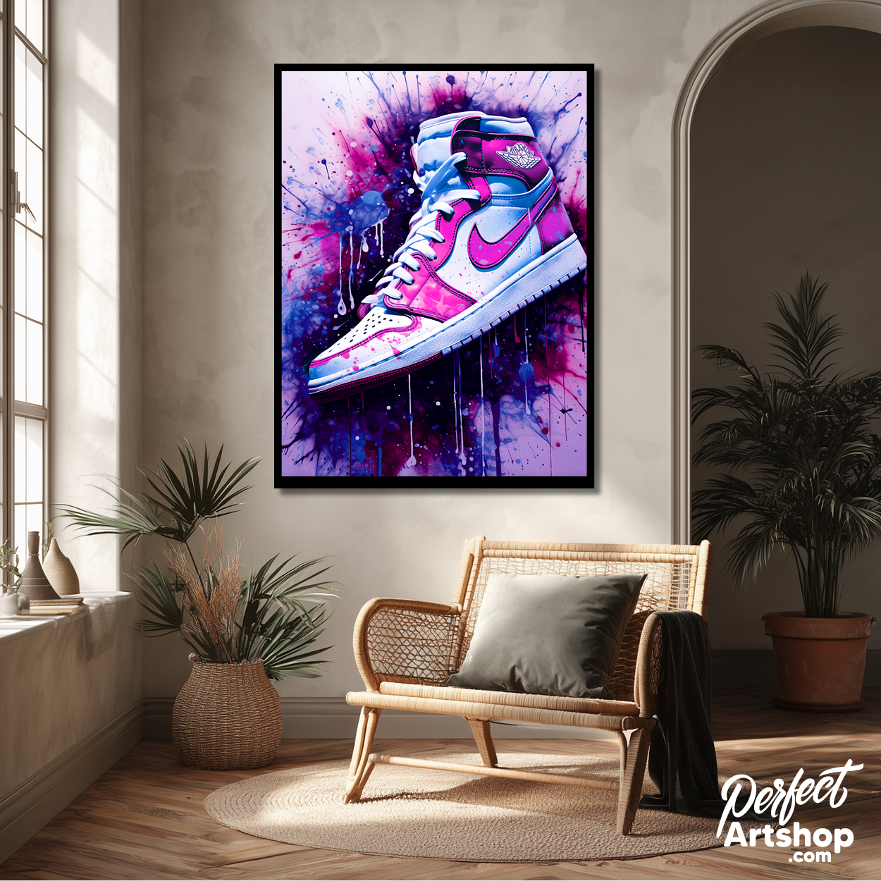 Kunstwerk van een Nike sneaker op een graffiti achtergrond.