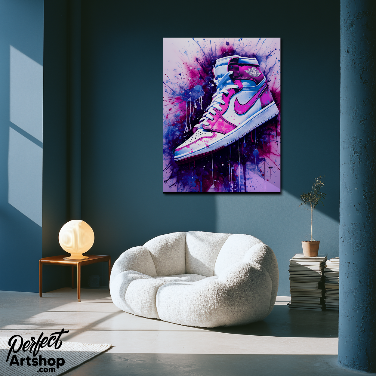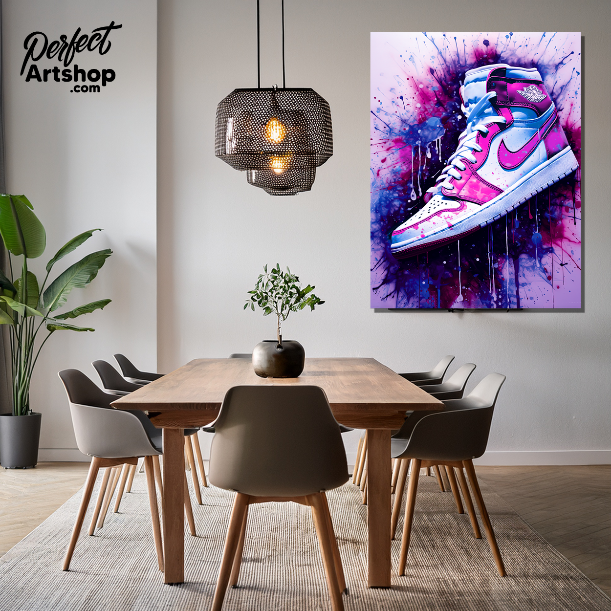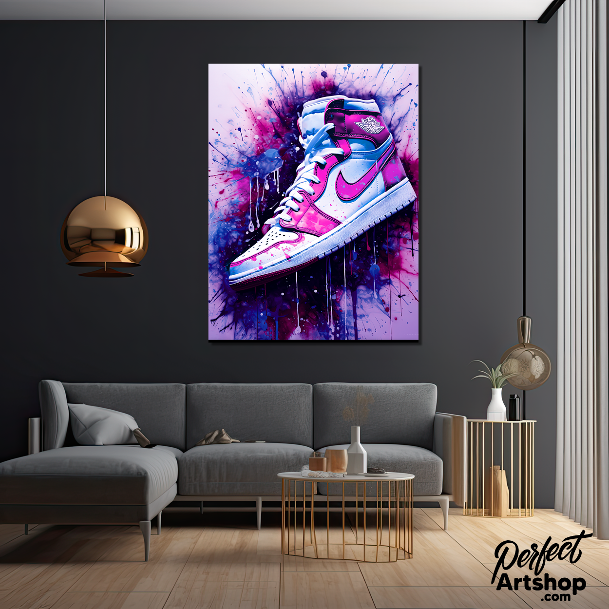 Kunstwerk van een Nike sneaker op een graffiti achtergrond.